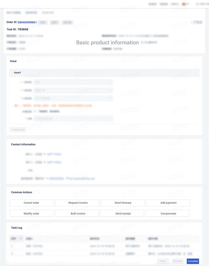 A system for customer service agents to resolve user issues. When a customer calls, the agent opens the related order and creates a task to track and address the problem.