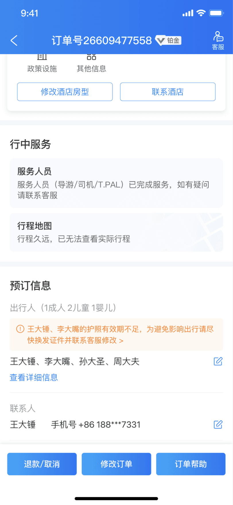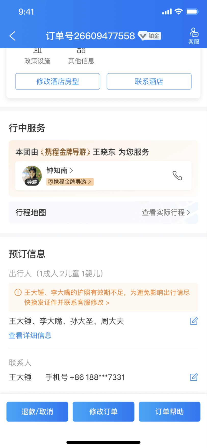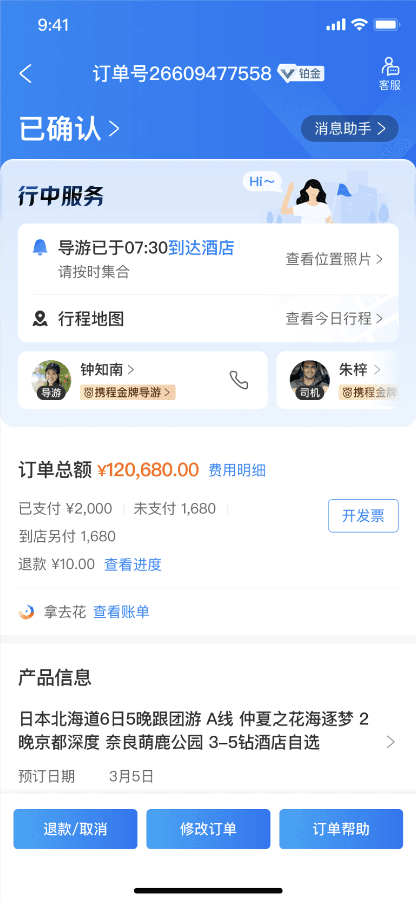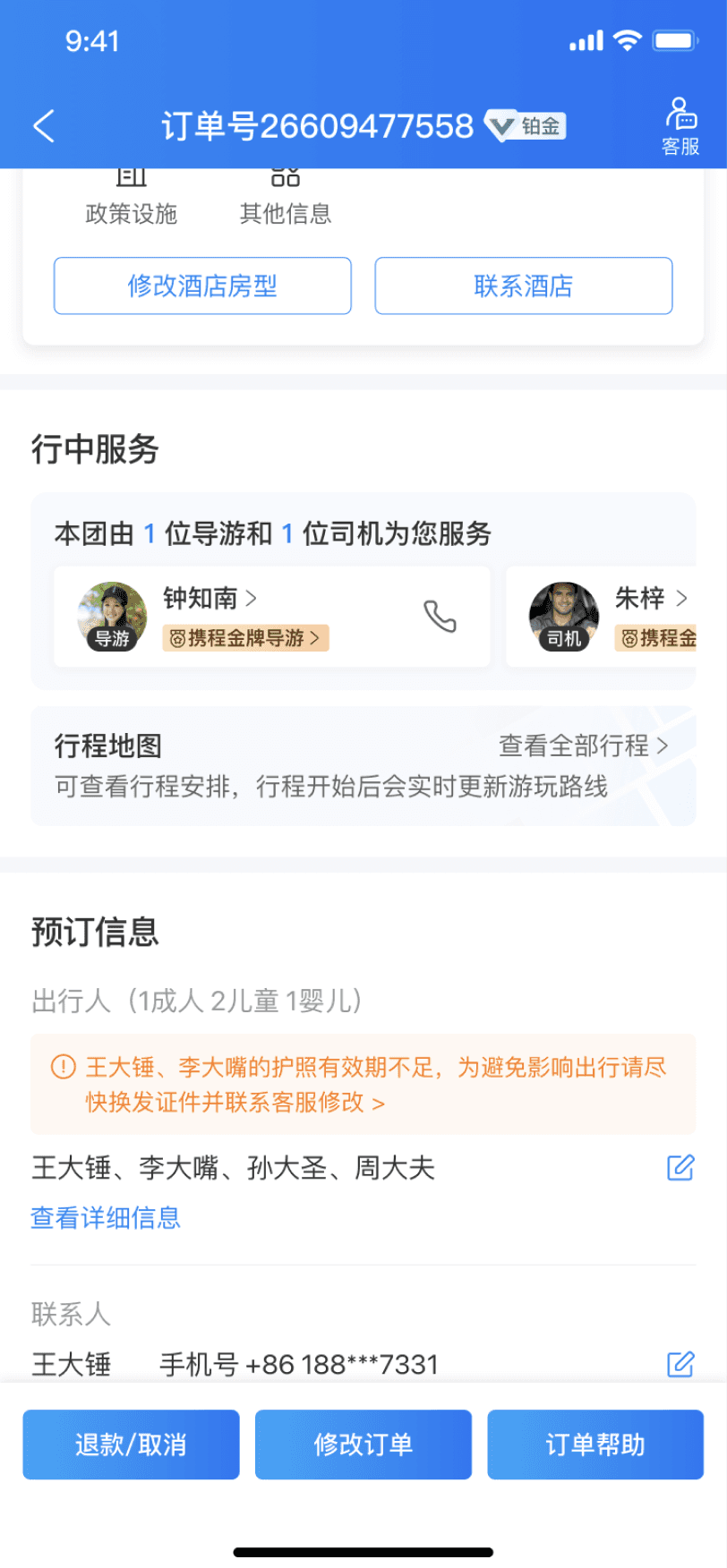 On order page, user can check all the resources in the group tour package, including flight, hotel, itinerary and guide. It’s frequently opened by users, with a frequency of 12.8 times/user.