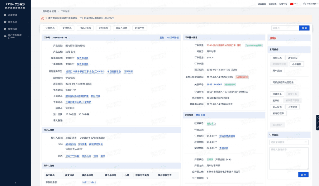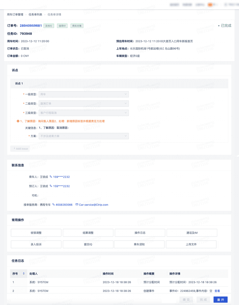 一个供客服解决用户问题的系统。当客人拨打电话进线时,客服打开相关订单并创建任务以跟踪和解决问题。